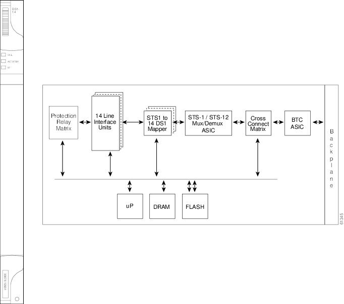 Figure 3-2 shows the DS1-14 faceplate and the block diagram of the card.