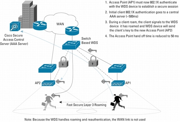 Fast secure roaming is supported by Cisco and Cisco Compatible client devices in conjunction with Cisco Aironet, Cisco IOS Software-based access points. With fast secure roaming, authenticated client devices can roam securely from one access point to another, within or across subnets, without any perceptible delay during reassociation. Fast secure roaming supports latency-sensitive applications such as wireless voice over IP (VoIP), enterprise resource planning (ERP), or Citrix-based solutions (Figure 2).
