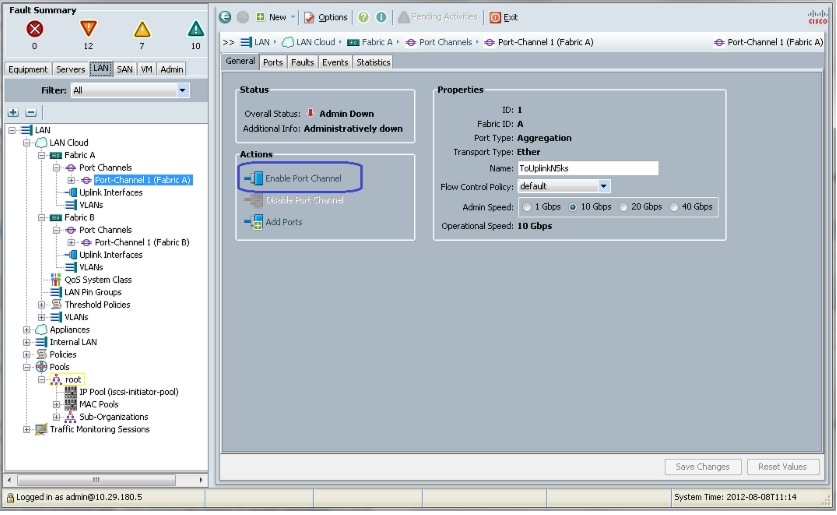 Administratively shutdown one of the two uplinks connected to the Cisco Nexus 5548UP switches from FIs. Make sure that connectivity is not affected. Upon administratively enabling the shutdown port, the traffic should be rebalanced. This can be validated by clearing interface counters and showing the counters after sending some of the data from the virtual machines.