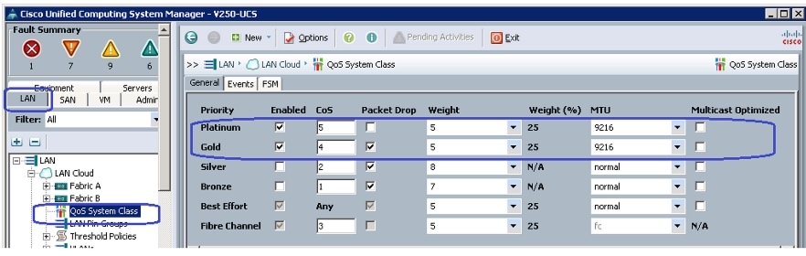 Make sure that the MTU 9216 is set in the UCSM system class configuration, and QoS policy is correctly set in the port-profiles.