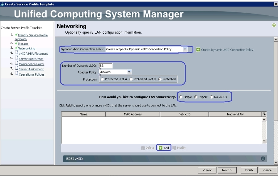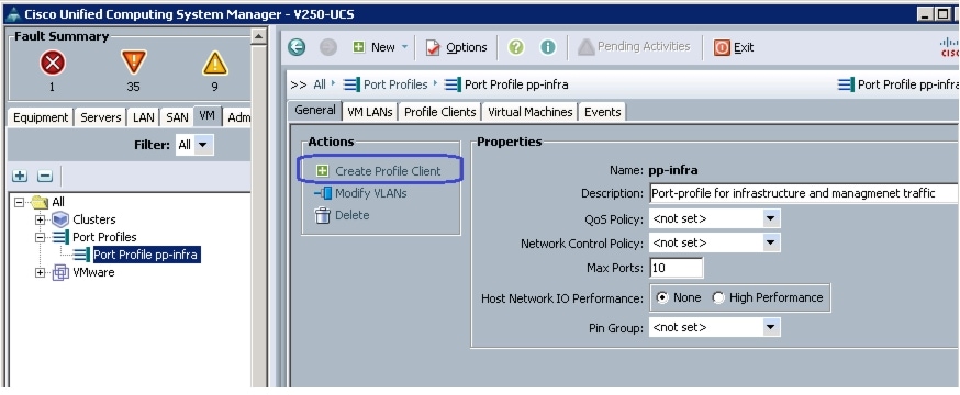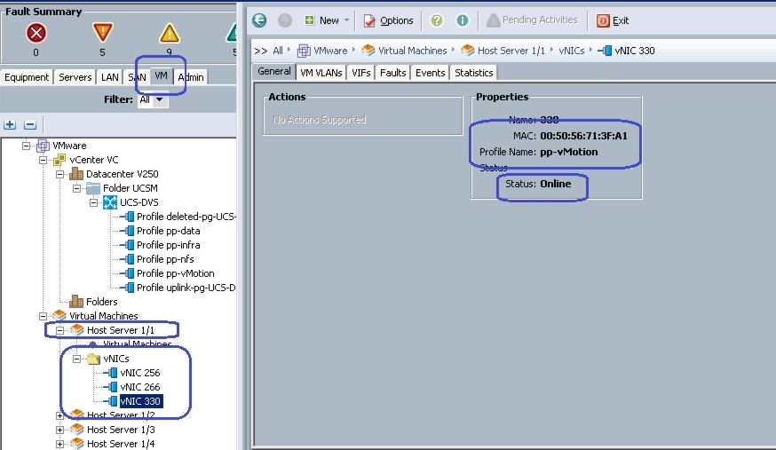 You can verify in the UCSM window that every hypervisor host has now 3 vNICs, one in each "pp-vMotion", "pp-infra" and "pp-nfs" port-profile. This can be verified on the "VM" tab by clicking VMware > Virtual Machines, "Host Server x/y" and "vNICs" as highlighted in Figure 227.