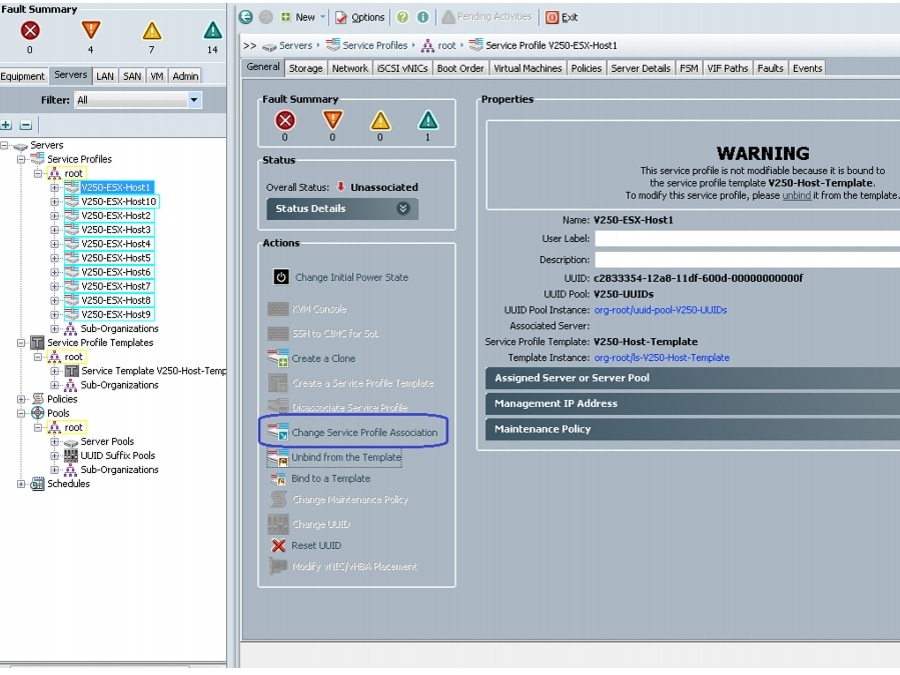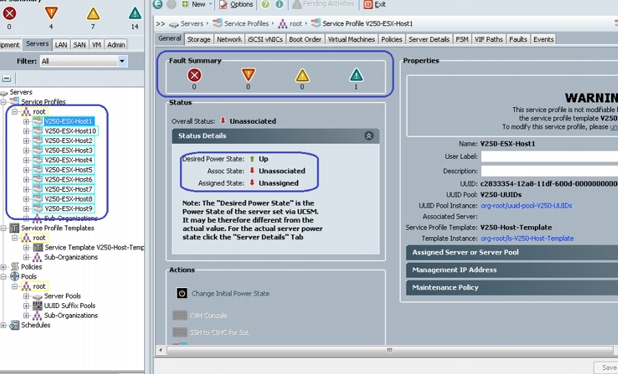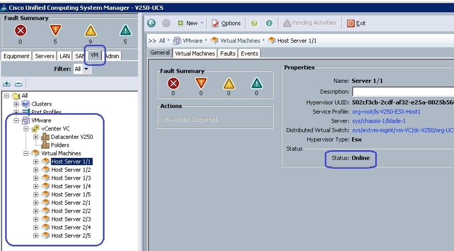In the UCSM window, you can validate the hosts added to VM-FEX vDS by clicking on the "VM" tab, and expanding "VMware", "Virtual Machines" as shown in Figure 218. The "Status" of all the ten servers should show as "Online". Note that UCSM identifies hypervisor hosts by chassis ID and blade ID combination, unlike vCenter which identifies the servers by IP addresses.