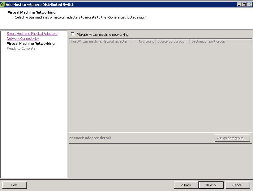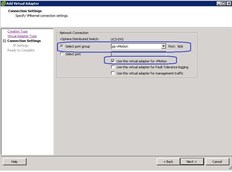 Select the "pp-vMotion" port profile from the drop-down list and check the check box "Use this virtual adapter for vMotion". Click Next.