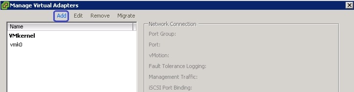 In the vCenter window, click Inventory > Hosts and Clusters. Select an individual ESX host and click Configuration > Networking > vSphere Distributed Switch button on the right pane of the vCenter window. Click Manage Virtual Adapters... link as shown in Figure 219.