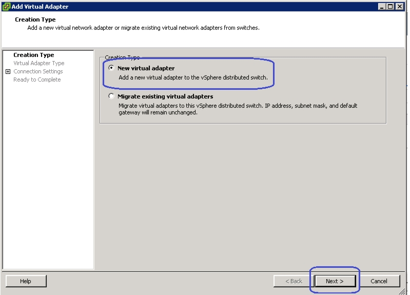 Click New virtual adapter radio button for Creation Type and click Next as shown in Figure 221.