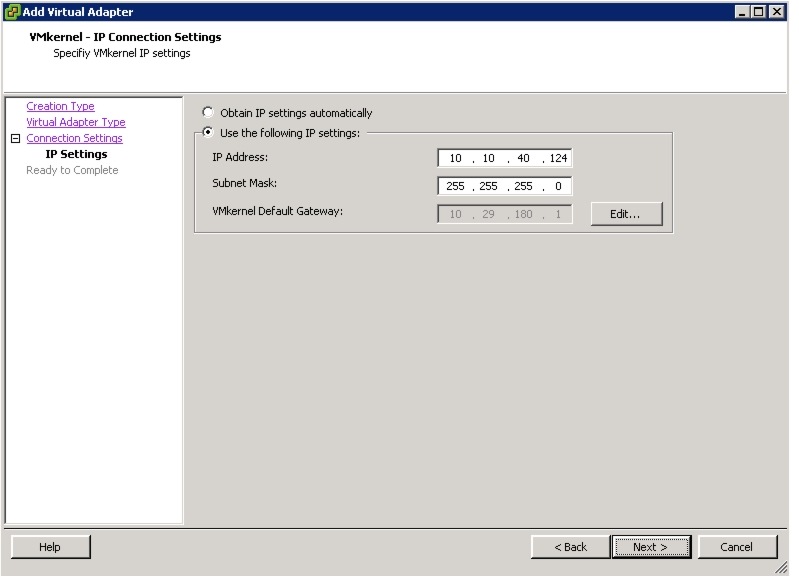 We need to create two more kernel interfaces per host, one for vMotion and one for NFS storage access by the kernel. Choose the appropriate port profiles for the same. For both the vMotion and the NFS kernel interfaces, choose the MTU to be jumbo 9000 MTS for bulk transfer efficiency. Follow these steps: