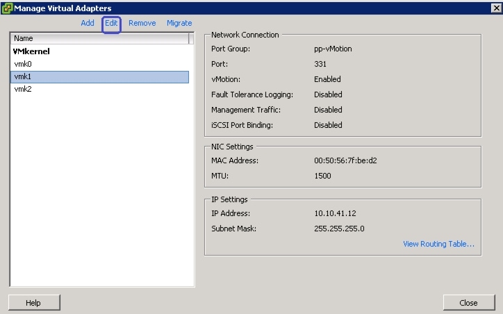 Both vMotion and NFS based storage access require jumbo MTU for the efficient bulk transfer. Select the "vmk1" interface and click Edit as shown in Figure 225.