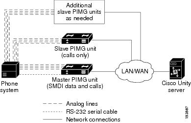 The Ericsson MD-110 PIMG integration sends call information and MWI requests through the data link, which is an RS-232 serial cable that connects the phone system and the master PIMG unit. Voice connections are sent through the analog lines between the phone system and the PIMG units. The PIMG units communicate with the Cisco Unity server through the LAN or WAN by using Session Initiation Protocol (SIP). Figure 1 shows the required connections.