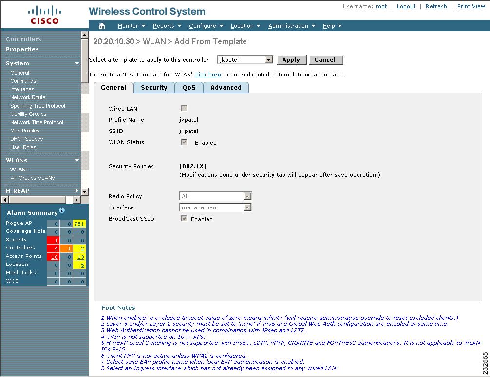 Note If NAC is enabled and you created a quarantined VLAN for use with this WLAN, make sure to select it from the Interface drop-down box under General Policies. Also, check the Allow AAA Override check box to ensure that the controller validates a quarantine VLAN assignment.