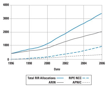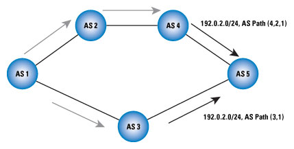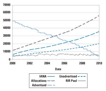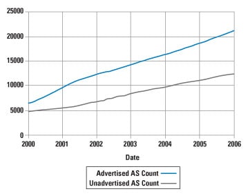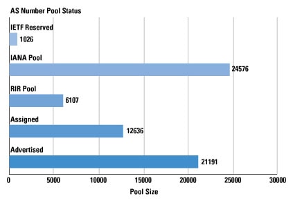 by Geoff Huston, APNICSo what are Autonomous System Numbers (ASNs), and what role do they play in the technology of the Internet? This article explores the role of ASNs as a critical element of the Internet routing architecture. We will first explore how the AS number space is structured, examine how ASNs are used in the interdomain routing environment and then look at the consumption rate of these numbers, and finally examine our options when we get to the point of likely ASN pool exhaustion. However, in order to put this into context, a brief overview of Internet routing architecture follows. Internet Routing ArchitectureInternet routing architecture is structured as a two-level hierarchy. The environment is first partitioned into domains with each domain using an internal routing environment. These network domains use an interior routing protocol (commonly referred to as an Interior Gateway Protocol [IGP]), which maintains a complete mapping set for the current internal topology of the domain, together with the set of “best paths” between any two points within the network domain. Although this approach of having a routing protocol automatically maintaining a comprehensive view of the current topology can be made to work within even quite large routing domains, such an approach does not scale to the size of the entire Internet. Fine-grained topology information is useful only in “local” situations, and is best omitted when forming a larger view of the network. Commonly used interior routing protocols include Open Shortest Path First (OSPF), Intermediate System-to-Intermediate System (IS–IS), and Enhanced Interior Gateway Routing Protocol (EIGRP). The second level in the routing hierarchy is the interdomain routing domain. The interdomain routing environment describes how domains interconnect, but avoids the task of maintaining transit paths within each domain. In the interdomain space, a routing path to an address is described as a sequence of domains that must be transited to reach the domain that originates that particular address prefix. Today this interdomain space is maintained using Version 4 of the Border Gateway Protocol (BGPv4). Each routing domain is a single administrative domain, operated within a uniform set of routing policies, and is operated independently from any other domain. The domain is in effect an autonomous unit in the overall routing architecture, and is termed an Autonomous System (AS). Each of these ASs is uniquely identified using an Autonomous System Number (ASN). What Is an Autonomous System?One of the best definitions of an Autonomous System can be found in an IETF document, RFC 4271 [4] that describes BGPv4: “The classic definition of an Autonomous System is a set of routers under a single technical administration, using an interior gateway protocol (IGP) and common metrics to determine how to route packets within the AS, and using an inter-AS routing protocol to determine how to route packets to other ASs. Since this classic definition was developed, it has become common for a single AS to use several IGPs and sometimes several sets of metrics within an AS. The use of the term Autonomous System here stresses the fact that, even when multiple IGPs and metrics are used, the administration of an AS appears to other ASs to have a single coherent interior routing plan and presents a consistent picture of what destinations are reachable through it.” The AS Number PoolASNs are drawn from a 16-bit number field, allowing for 65,536 possible values. AS 0 is reserved, and may be used to identify nonrouted networks. The largest value—AS 65,535—is also reserved. The block of ASNs from 64,512 through 65,534 is designated for private use. ASN 23,456 is reserved for use in ASN pool transition. The remainder of the values, from 1 through to 64,511 (less 23,456), are available for use in Internet routing. The number space is unstructured, because there are no internal fields in the number structure, nor is there any aggregation or summarization capability for ASNs. How AS Numbers Are Used in BGPThe interdomain routing space is constructed using two components: address prefixes and AS numbers, which are used as domain identifiers. Every prefix has an originating domain, known as the Origin AS from which reachability for the prefix is propagated across the interdomain space. As the routing advertisement is propagated across the interdomain space, each prefix accumulates an associated “AS path.” When an address prefix advertisement transits a domain, the domain effectively “signs” the prefix advertisement by prepending its ASN to the AS path associated with the address prefix. At any point in the network the AS path describes a sequence of connected domains that forms a path from the current point to the originating domain. This setup is shown in Figure 1, where AS1 originates an advertisement for the address prefix 192.0.2.0/24. At AS5, the AS receives two BGP advertisements for this prefix. One has the AS path (4, 2, 1), and the other has the AS path (3, 1). The left-most number in the AS path list is the ASN of the adjacent AS from which the address prefix advertisement was received. The sequence of numbers indicates the sequence of ASs though which this update was propagated. The right-most, or final ASN, is the AS number of the AS that originated the address prefix advertisement, or Origin AS. The AS path serves two purposes in interdomain routing: that of a path length metric and a loop detection mechanism. The AS path is used as a path metric in the BGP path selection algorithm. When a domain receives two different BGP advertisements for the same address prefix, the default BGP selection process is that of selection of the advertisement of the minimal-length AS path, with each AS in the path counting as a single unit of “cost.” In the case of the example network in Figure 1, AS5 prefers to use the path through AS3 to reach the originatin
