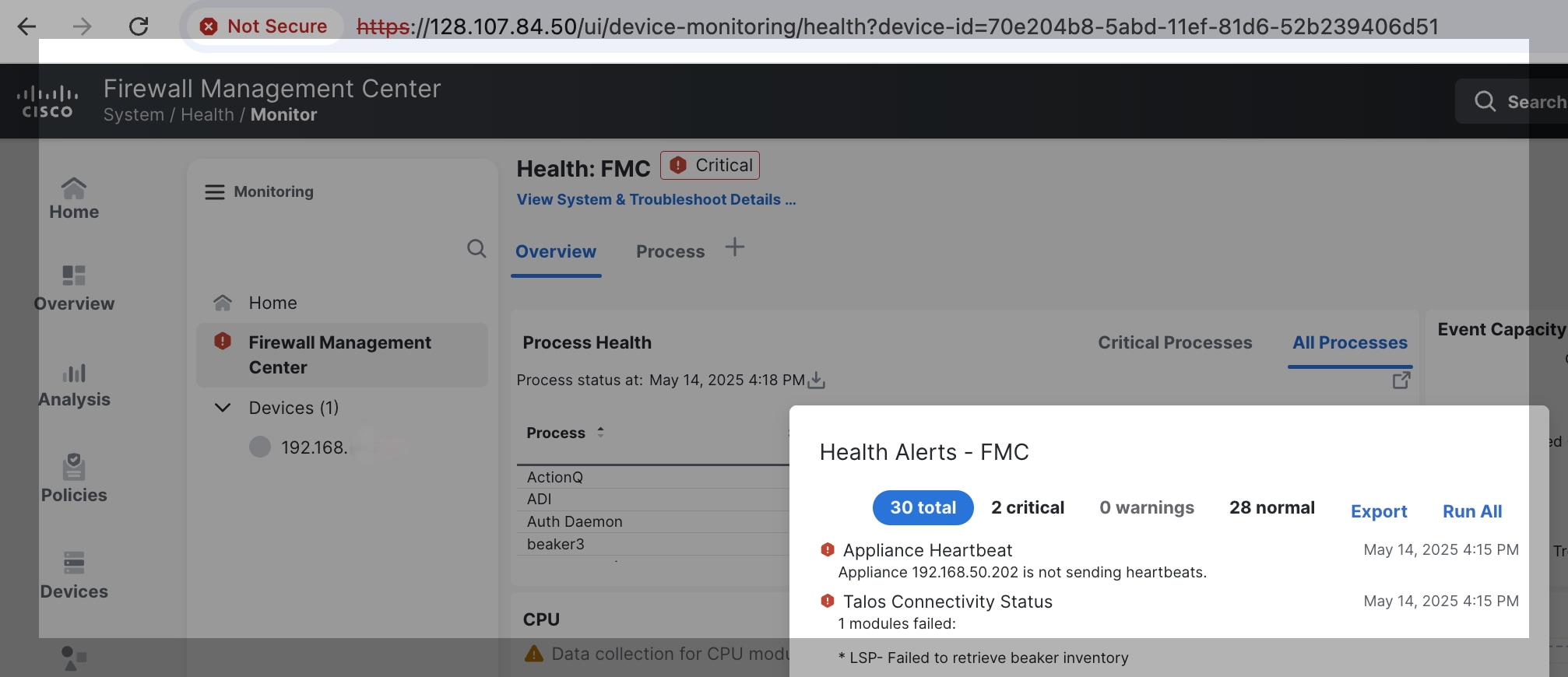 The following image shows an example of the Talos Connectivity Status error in the Health Alerts menu of Cisco FMC.
