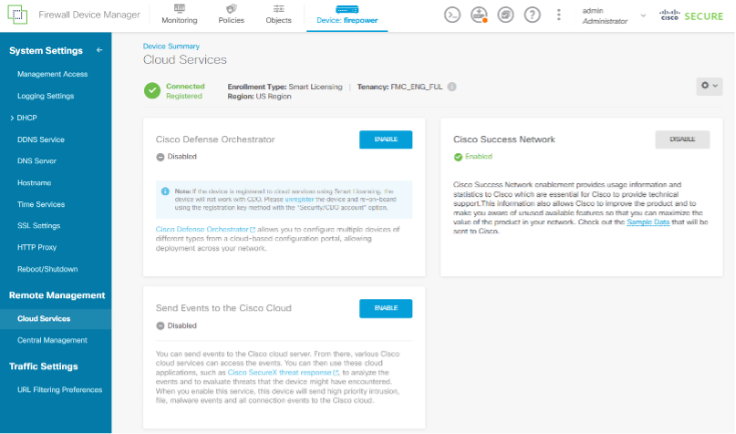 2. When the Smart License registration is complete, go to the Cloud Services screen and enable any of the three services.