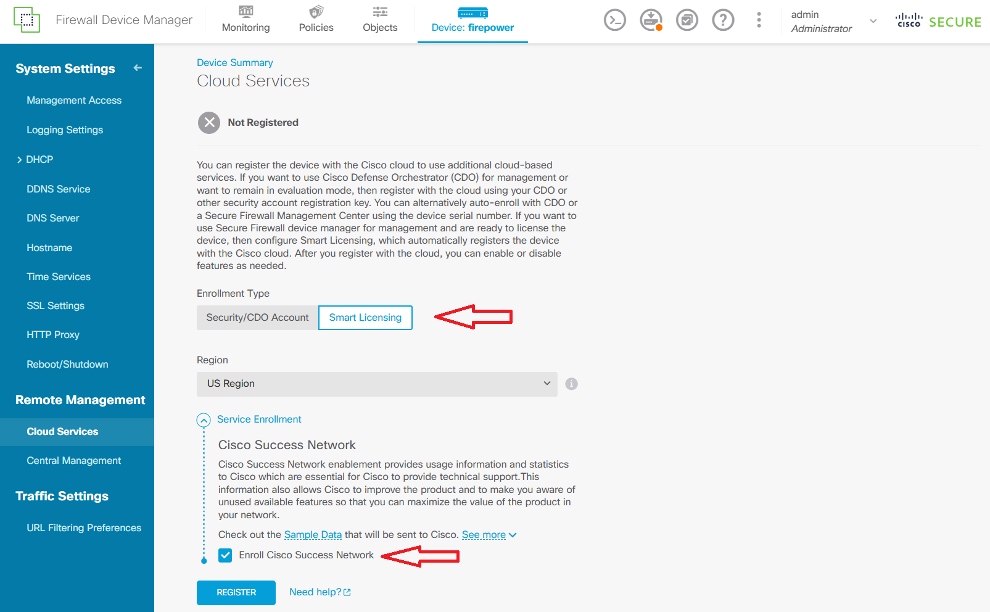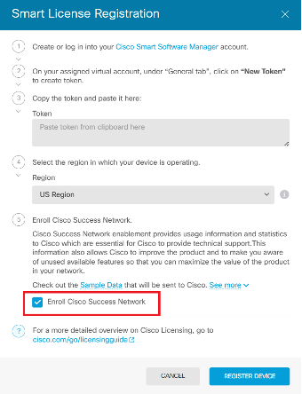 1. Register the device in Smart License and check the box next to Enroll Cisco Success Network (telemetry).