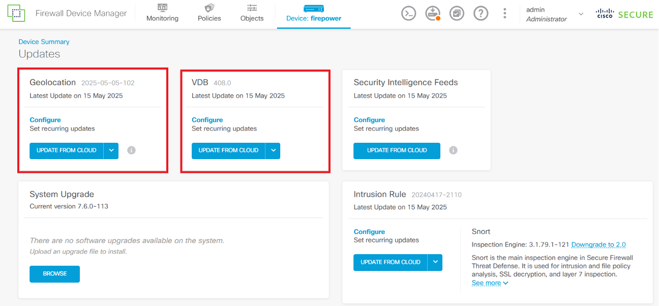 Step 2: Update the Vulnerability Database (VDB) or Geolocation Database (GeoDB). For update instructions, see the Secure Firewall Device Manager Configuration Guide for the appropriate Cisco Firepower Software release.
