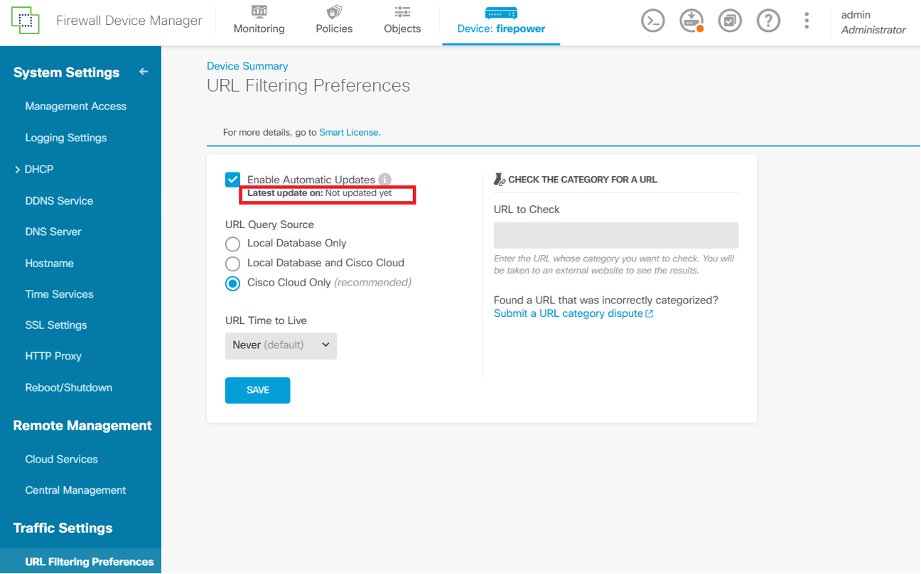 The Cisco FDM Device Summary screen will display the following error to indicate failure of the URLDB database update.