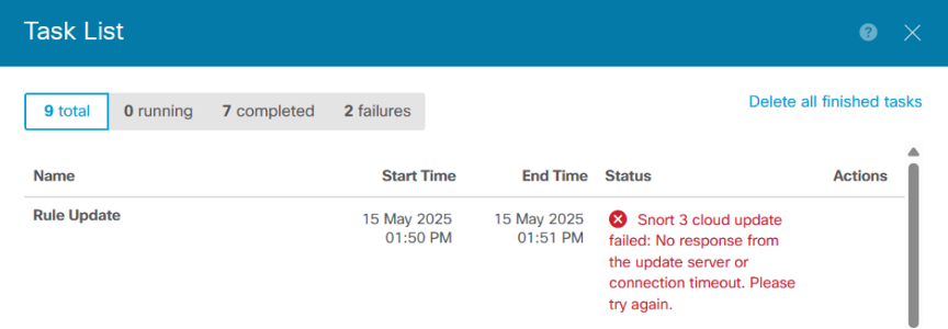 The Cisco FDM Task List screen will display the following error to indicate failure of the LSP for Intrusion Rules database update.