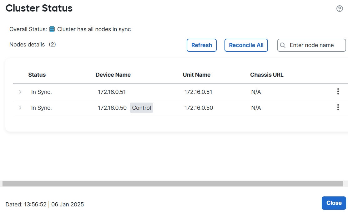 To ensure cluster control link functionality, be sure the round-trip time (RTT) between units is less than 20 ms. This maximum latency enhances compatibility with cluster members installed at different geographical sites. To check your latency, perform a ping on the cluster control link between units.