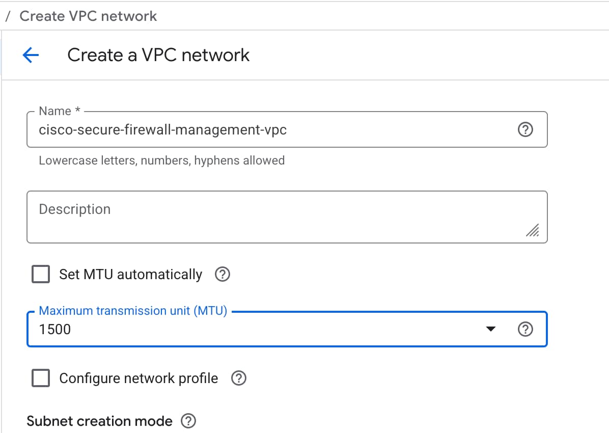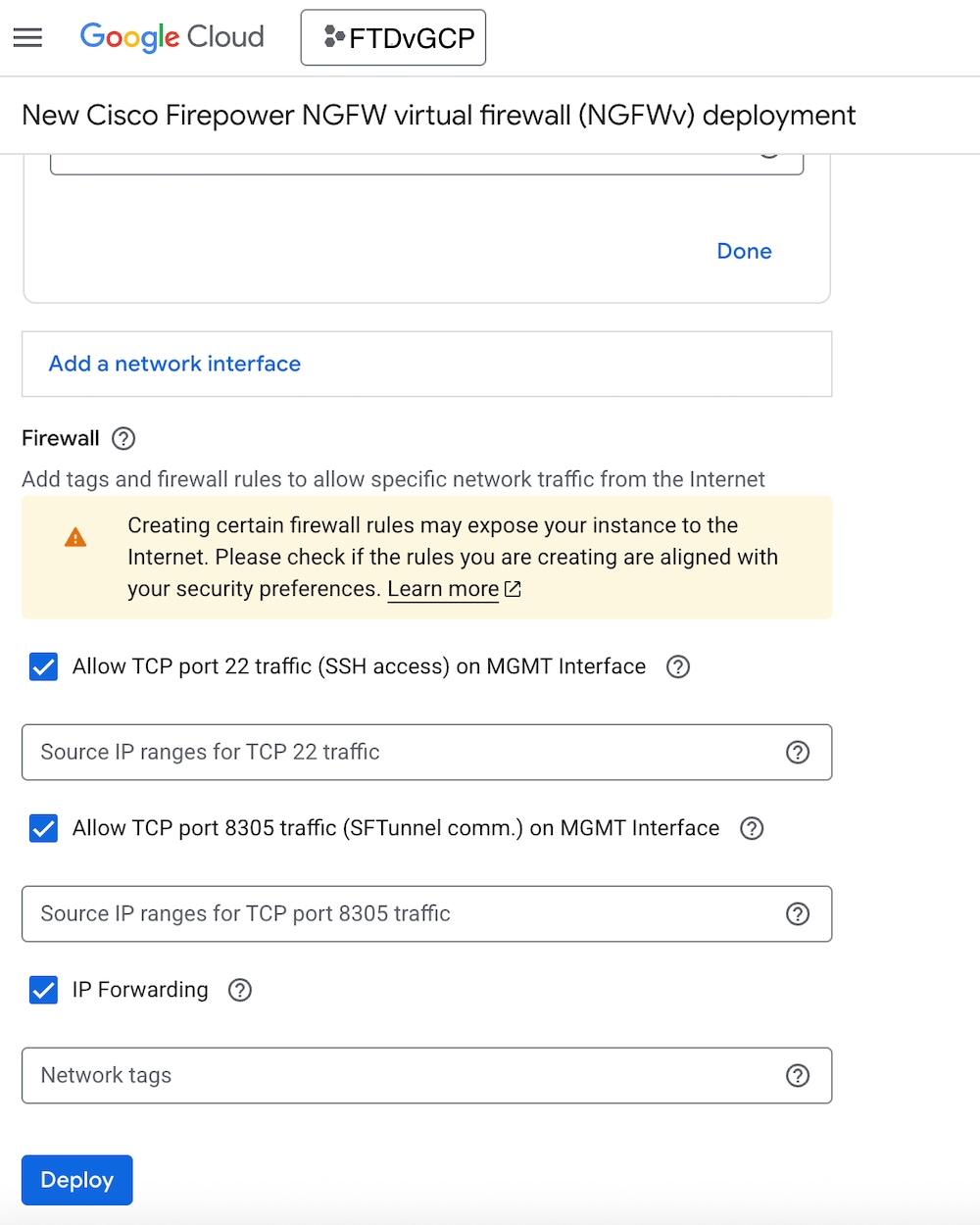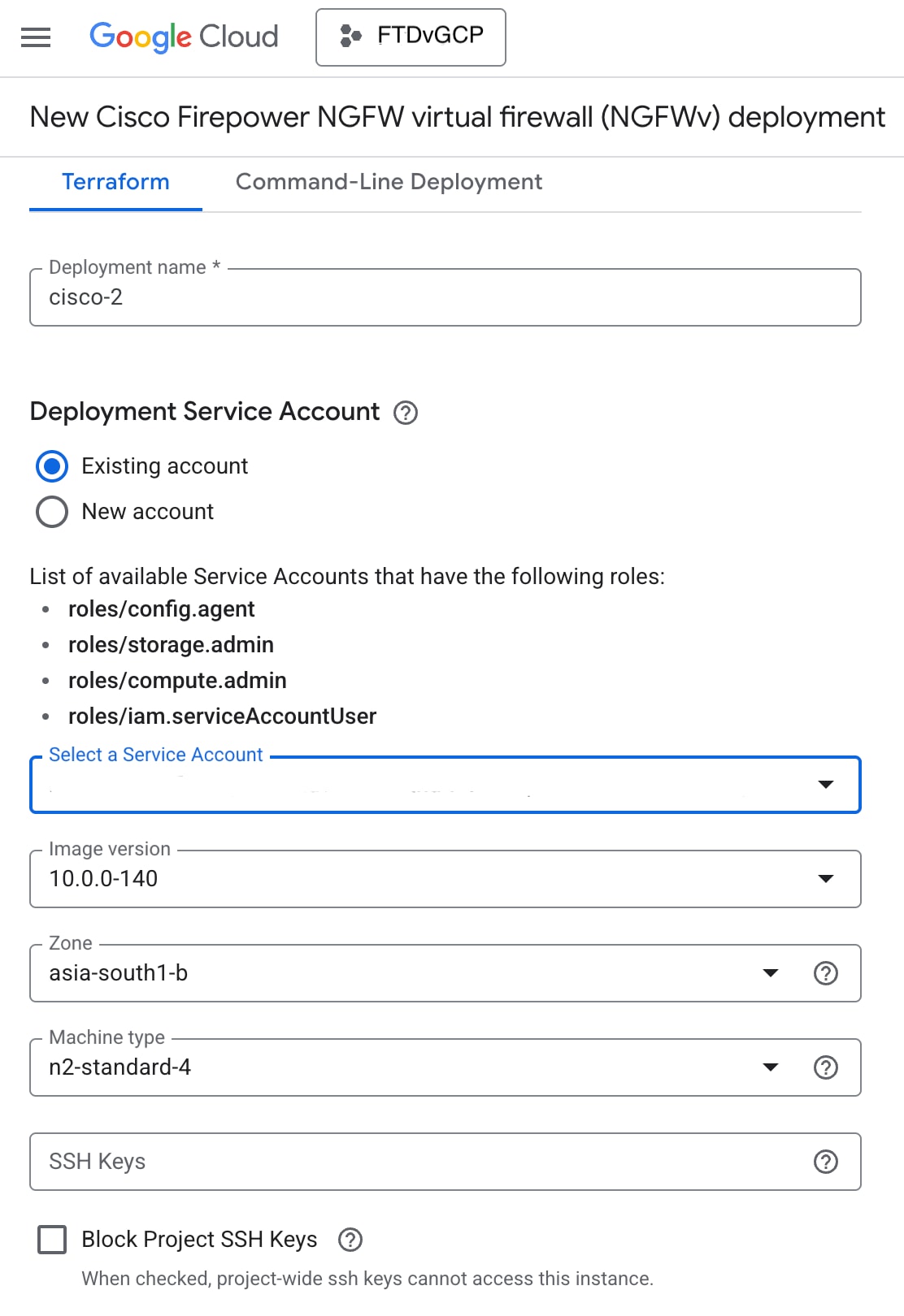 Select the Google virtual machine type and size to meet your Firewall Threat Defense Virtual needs. Currently, the Firewall Threat Defense Virtual supports both compute-optimized and general purpose machine types (standard, high-memory, and high-CPU machine types).