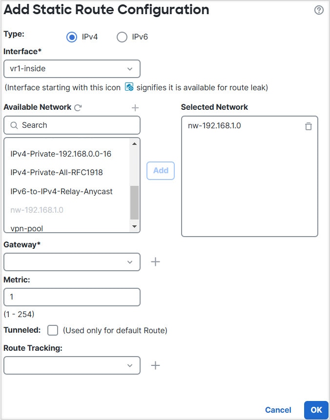 Static routes between virtual routers are known as route leaks, because you are leaking traffic to a different virtual router. When you are leaking routes, say, VR1 routes to VR2, you can initiate connections from VR2 to VR1 only. For traffic to flow from VR1 to VR2, you must configure the reverse route. When you create a static route to an interface in another virtual router, you do not need to specify a gateway address. Simply select the destination interface.