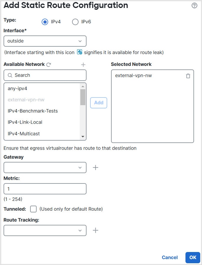 It is recommended to keep VTI interface, protected internal interfaces (loopback interface if supported for VTI) to be part of same virtual router to prevent the need for route leak.