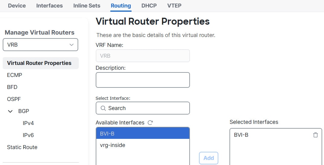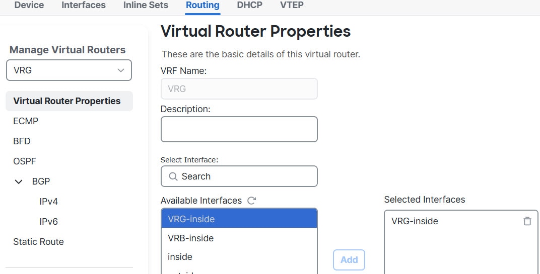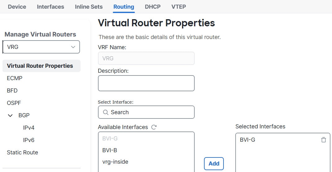 For a device with virtual routing capability, system creates a global virtual router by default. The system assigns all interfaces in your network to the global virtual router. A routed interface can belong to either a user-defined virtual router or a global virtual router. When you upgrade Firewall Threat Defense to a version which has virtual router capability, all its existing routing configuration becomes part of the global virtual router.