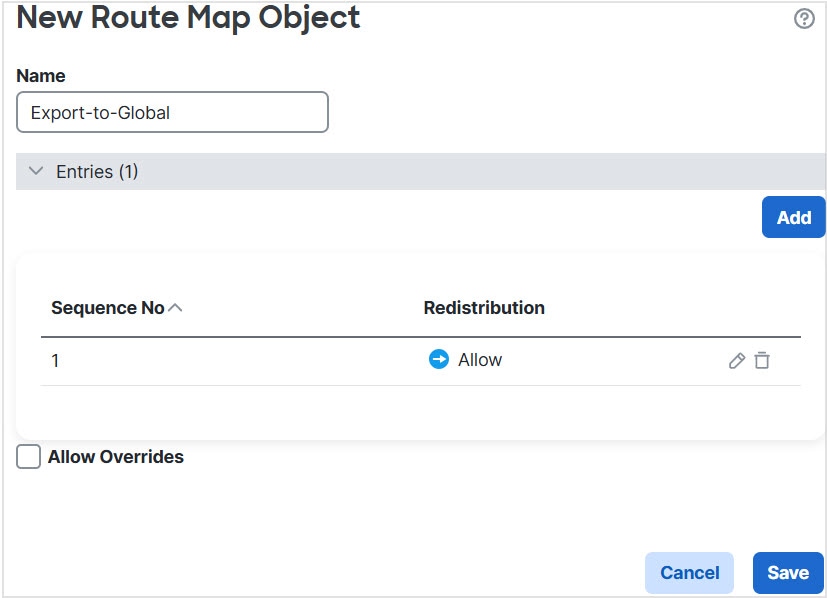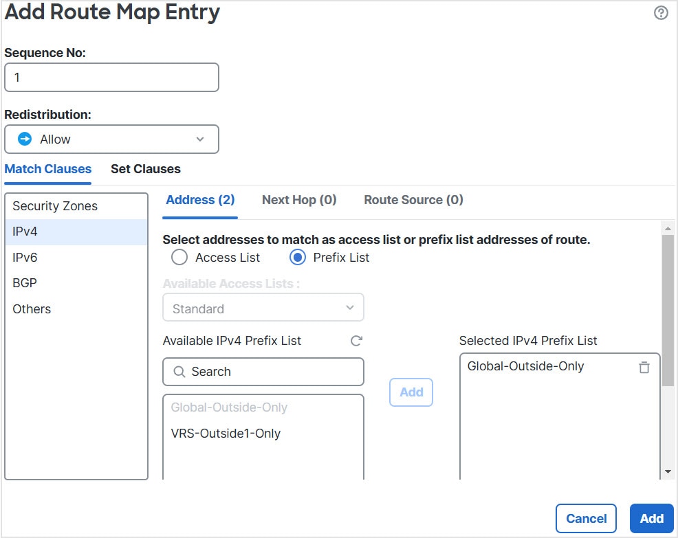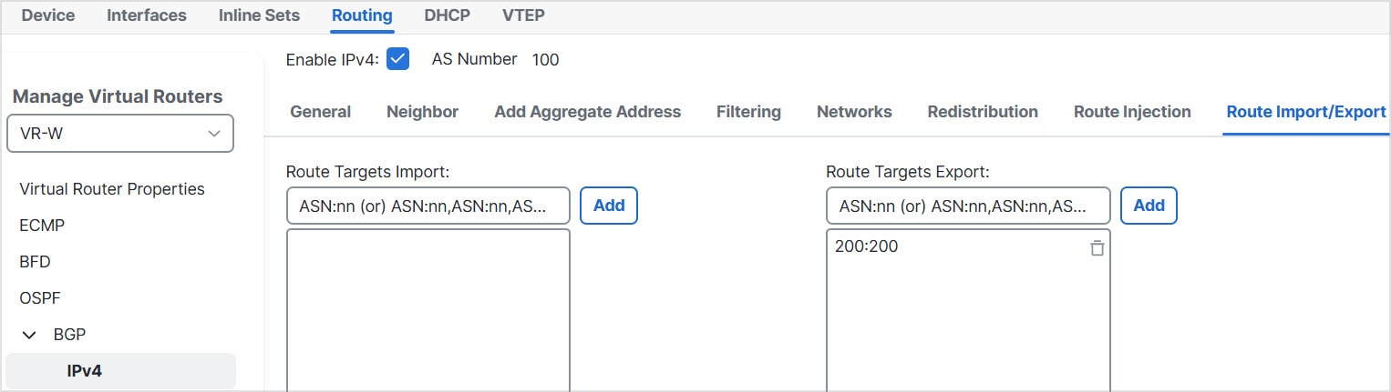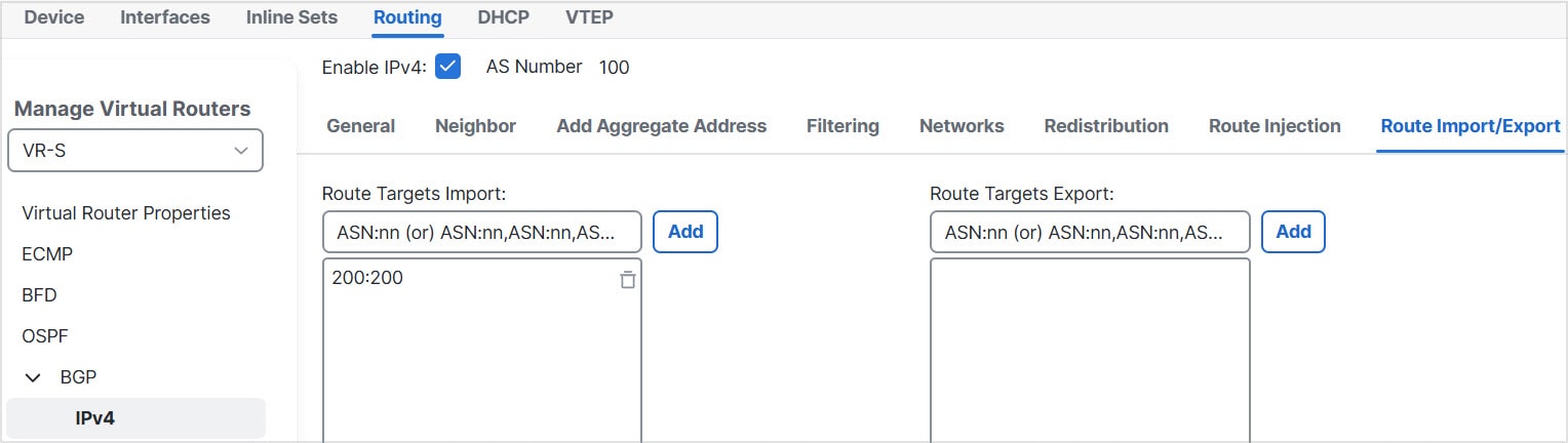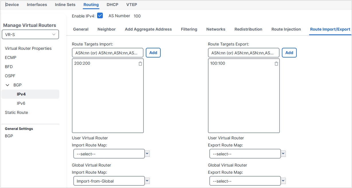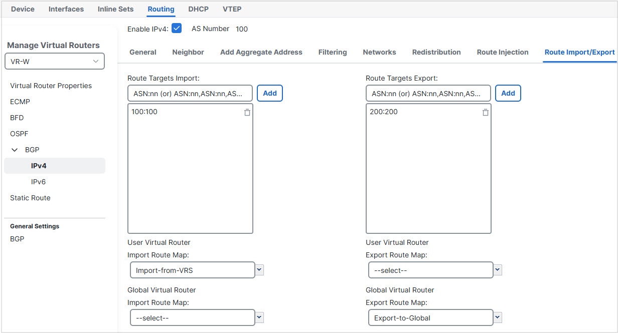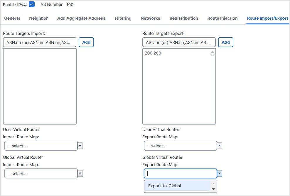 For details on configuring BGP route leaking, see Configure BGP Route Import/Export Settings.