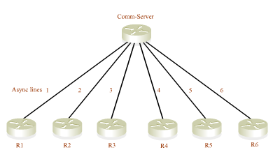 This lab shows how to configure a comm server to access only the console ports on other routers using reverse Telnet. Reverse Telnet allows you to connect via Telnet from a device you have a Telnet connection to, but on a different interface. For more information on reverse Telnet refer to "Establishing a Reverse Telnet Session to a Modem" on Cisco.com.