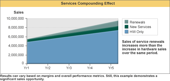 This scenario creates additional incremental revenue to your company of $1.6 million during the five-year time frame that you would not have realized without services sales. You will learn more about the impact services sales can have on your overall business in the “Generating Services Sales Opportunities” module.