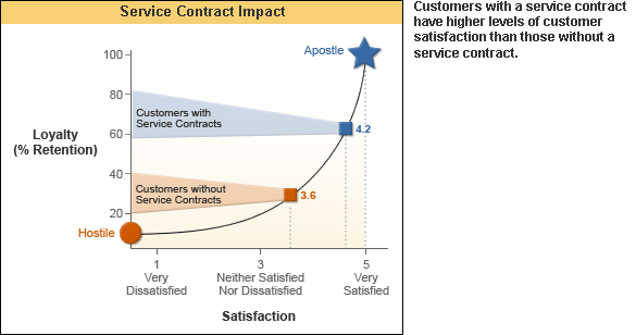 This graphic displays the results of a survey by the Harvard Business Review comparing customer satisfaction levels for customers with service contracts versus customers without service contracts.