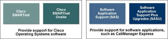 Software applications such as CallManager Express, Cisco Security Agent security software, and Unity Express are supported by SAS and SASU and may run on the Cisco platforms (supported by Cisco SMARTnet and SMARTnet Onsite) or may run on customer provided servers. It is important to distinguish between the two types of support.