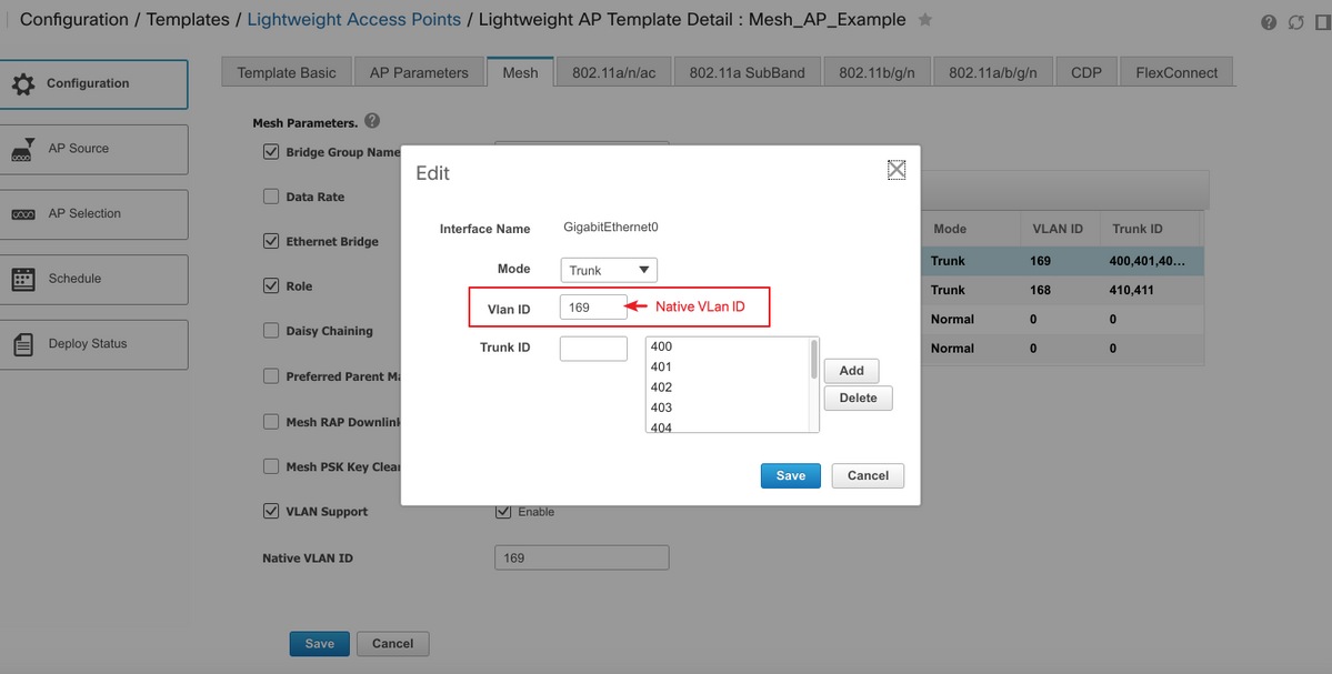 انتقل إلى التكوين > القوالب > نقاط الوصول في الوضع Lightweight وقم بإنشاء قالب جديد. الرجاء إنشاء إثنين من القوالب المختلفة ل RAP و MAP وإضافة أي ميزات/إعدادات يتم إستخدامها في النشر مثل اسم مجموعة جسر (BGN) المعرف من قبل المستخدم ودعم ودور شبكة LAN الظاهرية (VLAN) إلى القالب. يبدي المثال خريطة مع يتعدد VLAN دعم، و إثنان قارن (أن شنطة a few VLANs مختلف على إثنان ميناء)، و BGN مخصص (يعين HTTS-TEST).
