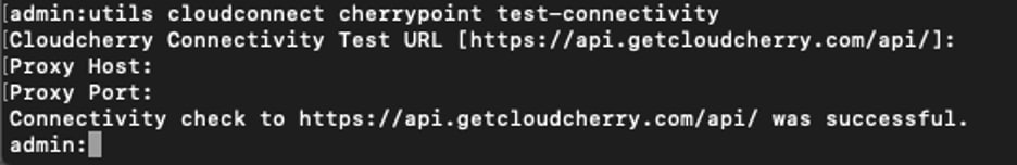 set cloudconnect cherrypoint config erasecat4000_flash:. utils cloudconnect cherrypoint test-connectivity الأمر داخل واجهة سطر الأوامر. أدخل معلومات مضيف الخادم الوكيل والمنفذ عند طلبها، وسيقوم نظام UCCX باختبار إتصاله. سترى رسالة نجاح كما هو موضح هنا إذا نجح الاتصال.