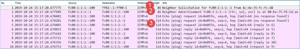 تم أخذ هذه الالتقاط بالتوازي مع إختبار اتصال ICMP من IP FC00:1:1:1::100 (داخل الموجه) إلى IP FC00:1:1:2::2 (موجه من الخادم).