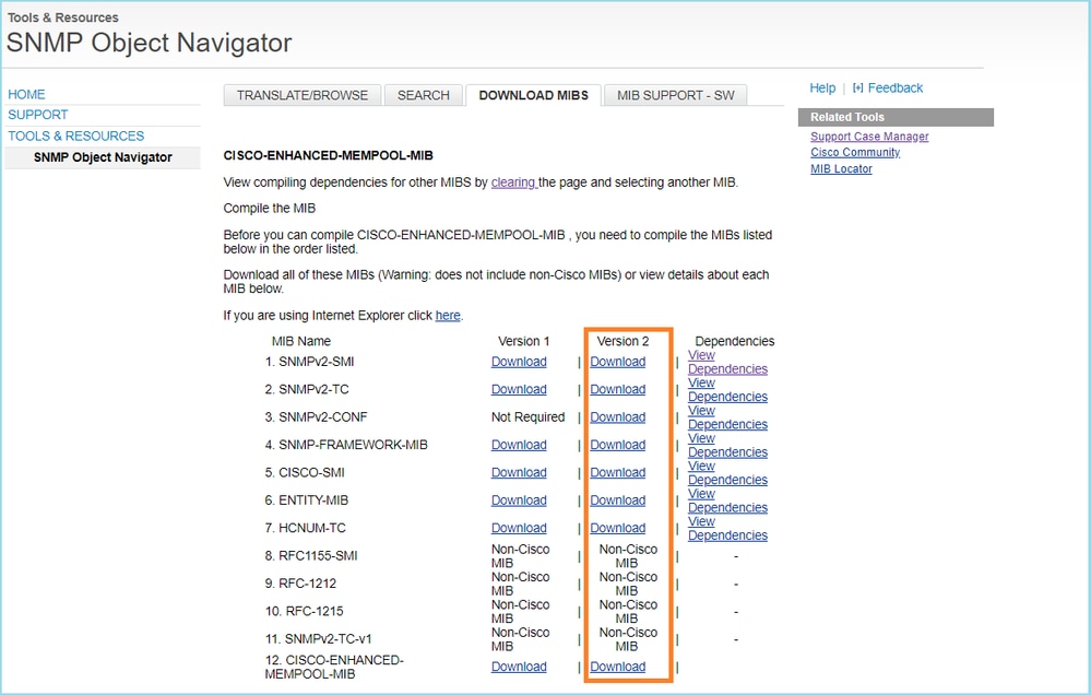 أظهر متصفح كائن SNMP أن OID 1.3.6.1.4.1.9.221.1 ينتمي إلى قاعدة معلومات الإدارة (MIB) المسماة Cisco-Enhanced-MEMPOOL-MIB، كما هو موضح في الصورة: