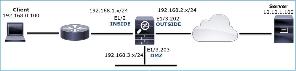 firewall# show run int e1/2 ! interface Ethernet1/2 nameif INSIDE cts manual propagate sgt preserve-untag policy static sgt disabled trusted security-level 0 ip address 192.168.0.1 255.255.255.0 ipv6 address fc00:1:1:1::1/64 ipv6 enable firewall# show run int e1/3.202 ! interface Ethernet1/3.202 vlan 202 nameif OUTSIDE cts manual propagate sgt preserve-untag policy static sgt disabled trusted security-level 0 ip address 192.168.103.96 255.255.255.0 ipv6 address fc00:1:1:2::1/64 ipv6 enable