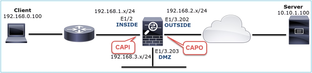 firepower# capture CAPI int INSIDE match ip host 192.168.0.100 host 10.10.1.100 firepower# capture CAPO int OUTSIDE match ip host 192.168.0.100 host 10.10.1.100