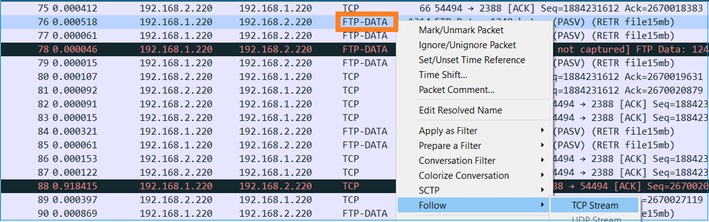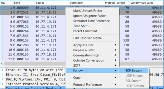 اتبع أحد تدفقات TCP (اتبع > تدفق TCP)، كما هو موضح في الصورة.