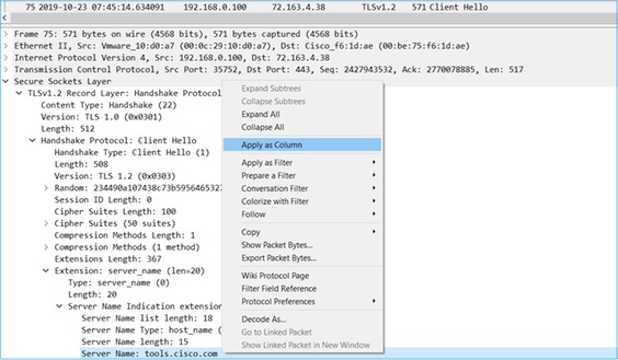 تلميح: تطبيق حقل اسم الخادم من SSL Client Hello كعمود.