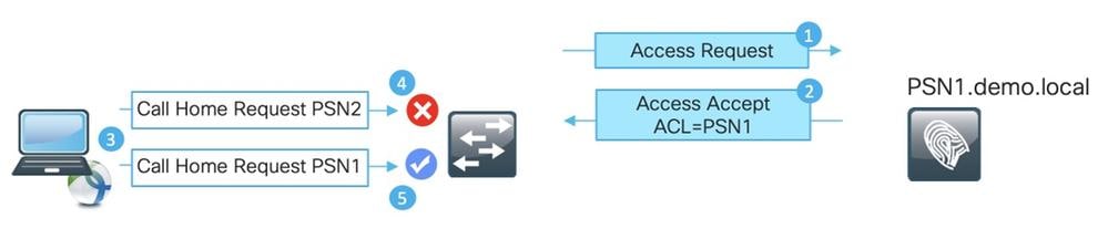عندما يكتشف PSN أنه يحتفظ بجلسة عمل وهمية/بدائية لنقطة النهاية، فإنه لا يرد على وحدة ISE Posture النمطية وهذا يسمح لنا بالحصول على الإجابة الصحيحة من PSN حيث حدثت آخر مصادقة.