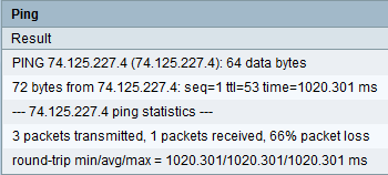 يتم إستخدام إختبار الاتصال لاختبار الاتصال بين الموجه وجهاز آخر على الشبكة المتصلة بهذا الموجه. يرسل إختبار الاتصال حزم طلبات صدى بروتوكول رسائل التحكم في الإنترنت (ICMP) من المضيف إلى المضيف الهدف. وتتضمن نتائج الاختبار الحالة والحزم المرسلة/المستلمة/المفقودة ومدة الذهاب والعودة.
