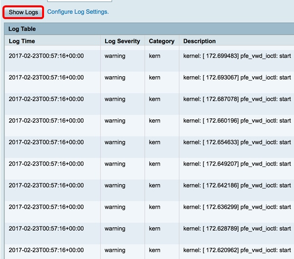 الخطوة 5. انقر فوق إظهار السجلات. يعرض الجدول وقت السجل وخطورته والفئة والوصف. التعاريف كما يلي: