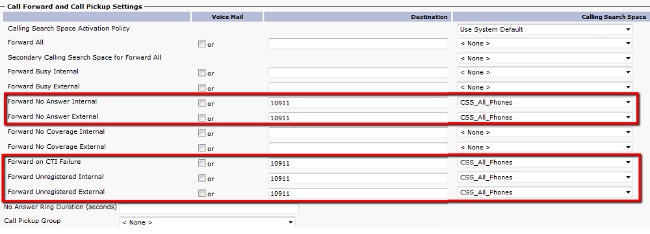 في بيئة CER لخادم واحد، قم بتعيين حقول إعادة توجيه المكالمات إلى الرقم الذي قمت بتكوينه ل ERL الافتراضي في CER. يتم شرح ERL الافتراضي في قسم قوائم التحكم في الوصول (ERLs) في هذا المستند.