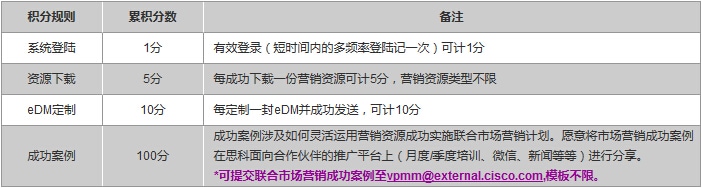 合作伙伴营销中心激励计划发布 尊敬的合作伙伴,您好! 数字化正在颠覆我们周围所熟悉的一切事物。在其影响下,人们接触品牌的方式、购物的方式,以及对商家的期望都发生了巨大变化。为了吸引客户,我们需要不断寻找全新的营销途径,打造令人记忆犹新的独特消费体验。 2016年1月25日思科全新上线了合作伙伴营销中心(Partner Marketing Central,简称PMC),并为您安排了一对一的营销资源合作伙伴 (MRP)培训,相信您已经参加或即将参加这一深入培训,并对合作伙伴营销中心有了全面而深入了解。作为思科深受信赖的合作伙伴,我们希望帮助您借助这些营销资源与方法更轻松地吸引客户,与更多客户实现频繁的业务接触,进而增加销售额,取得更大的成功。 为此,作为首批特邀合作伙伴,我们面向您特别发布思科FY16第四财季合作伙伴营销中心激励计划,并持续不断的为您提供感兴趣的、时下热门的多维度架构营销资源。