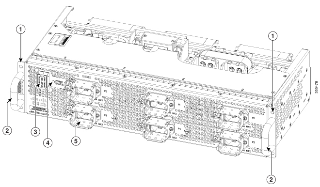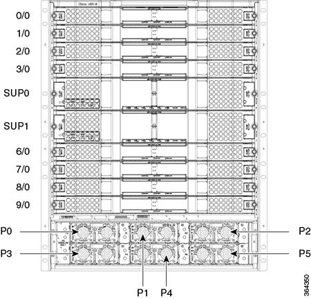 The Power Cassette Module supports six Power Modules. The front Power Module slots are numbered from P0 to P5 on the Power Cassette Module and these designations map to the facility power outlet markings on the rear of the chassis.
