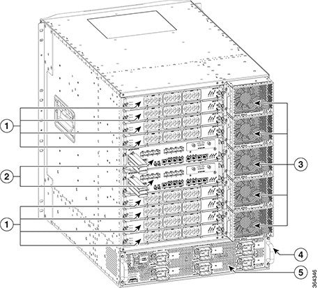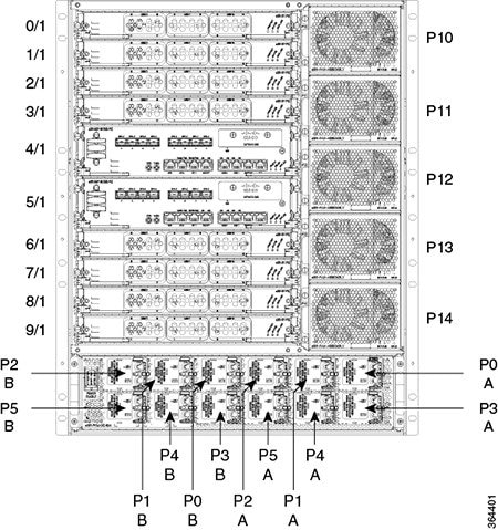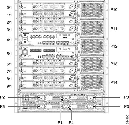 The Cisco cBR-8 router has multiple modular Fan Modules installed in the rear to supply cooling air and have five Fan Module bays in the rear of the chassis. The bays are numbered from P10 to P14.