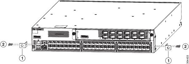 Align the two holes in one side of one of two front-mount brackets to two holes on the left or right side of the chassis (see the following figure). Be sure that the other side of the bracket is facing toward the front (port end) of the chassis. ![]()