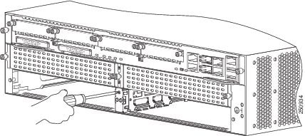 - Using the faceplate, push the NIM E-Series NCE into place until you feel the NIM seat securely into the connector on the router backplane. The NIM faceplate should contact the chassis rear panel.