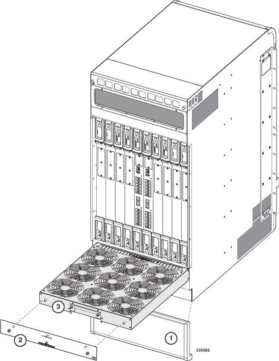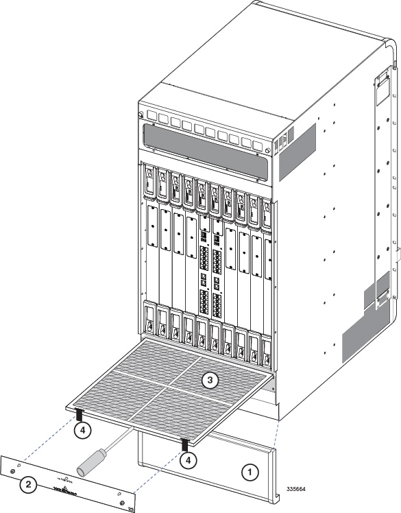 CautionDo not attempt to install air filters in the space above the upper fan trays. The top of the chassis is not designed for air filters. Installing air filters above the upper fan trays may cause power shorts.