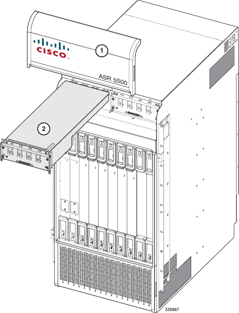 Step 1 At the front of the chassis, remove the cover panel from the top of the chassis. Firmly grasp the side edges of the panel and pull up and away to unsnap the panel. Put the panel safely aside. See figure below. Step 2 Loosen the screws and remove the upper fan tray access panel from the chassis. Place it safely aside. Step 3 Loosen the two screws that secure the fan tray to the chassis. Step 4 Grasp the center pull and pull the failed fan tray unit from the chassis. Step 5 Set the failed fan tray safely aside. Step 6 Hold the front of the replacement fan tray by its sides and align it with the upper fan tray bay of the chassis. Step 7 Slowly slide the fan tray into the chassis along the guides until the rear connector is firmly seated in the midplane. If the ASR 5500 is powered up, the fans should begin spinning. Step 8 Tighten the screws that secure the fan tray to the chassis. Step 9 Reinstall the access panel. Step 10 Reinstall the top cover panel by aligning it over the balled posts and snapping it in place. Step 11 For additional instructions, refer to Returning Failed Components.