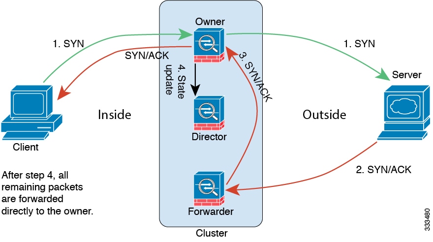 通过负载均衡将新连接定向到集群节点时,该连接的两个方向都由此节点所有。如果该连接有任何数据包到达其他节点,这些数据包都会通过集群控制链路被转发到所有者节点。如果反向流量到达其他节点,会被重定向回原始节点。